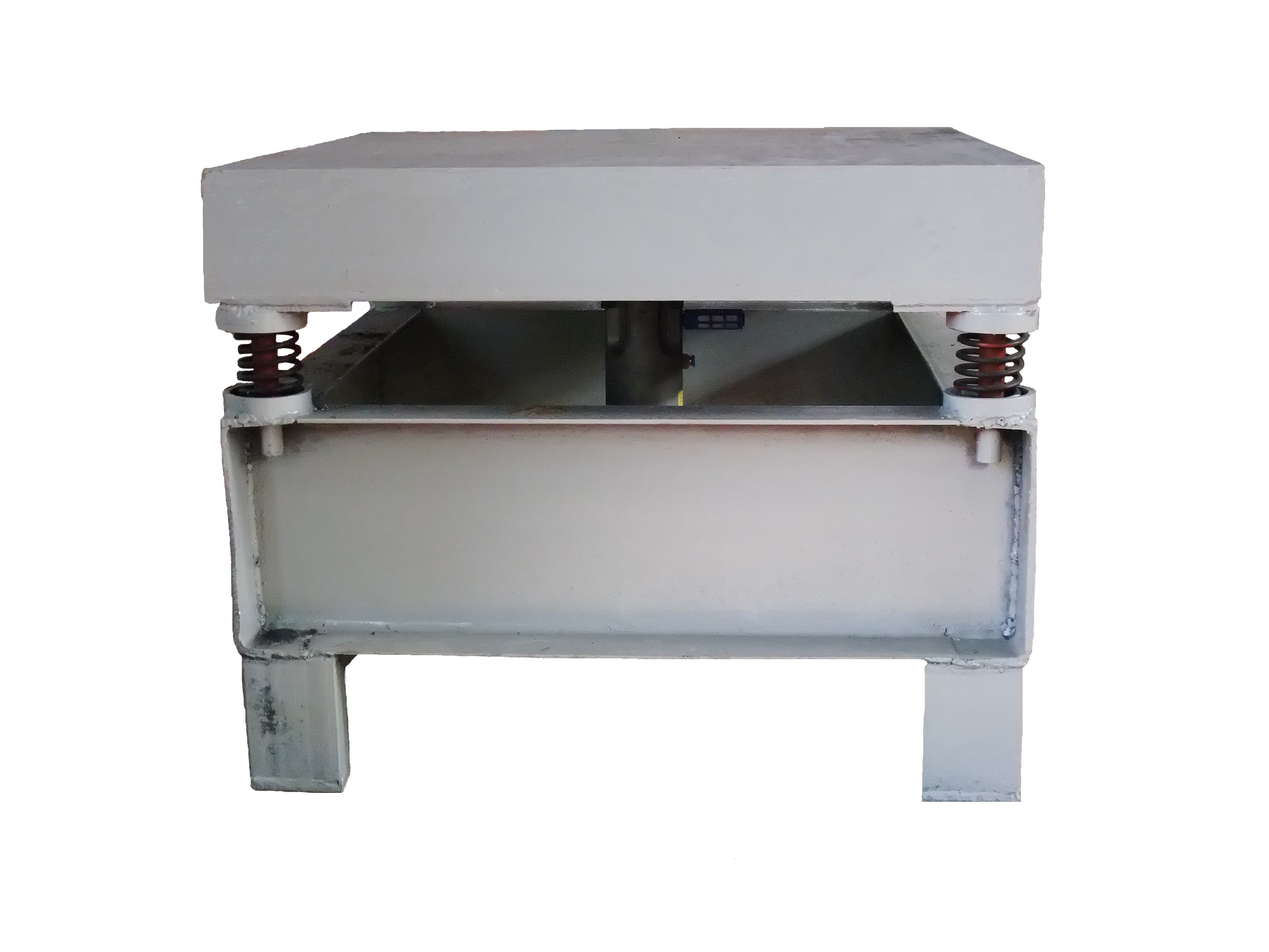 1、設(shè)備主體由12mm鋼板、槽鋼及工字鋼焊接而成,尺寸為1m*2m。采用提高加強筋受力的方式,使設(shè)備承重力達到1T以上,并確保設(shè)備在高負載、高頻率的振動下不變形不開裂。